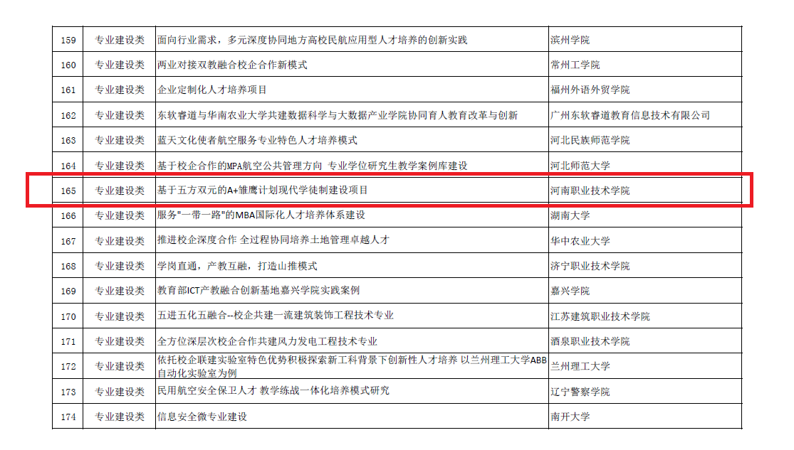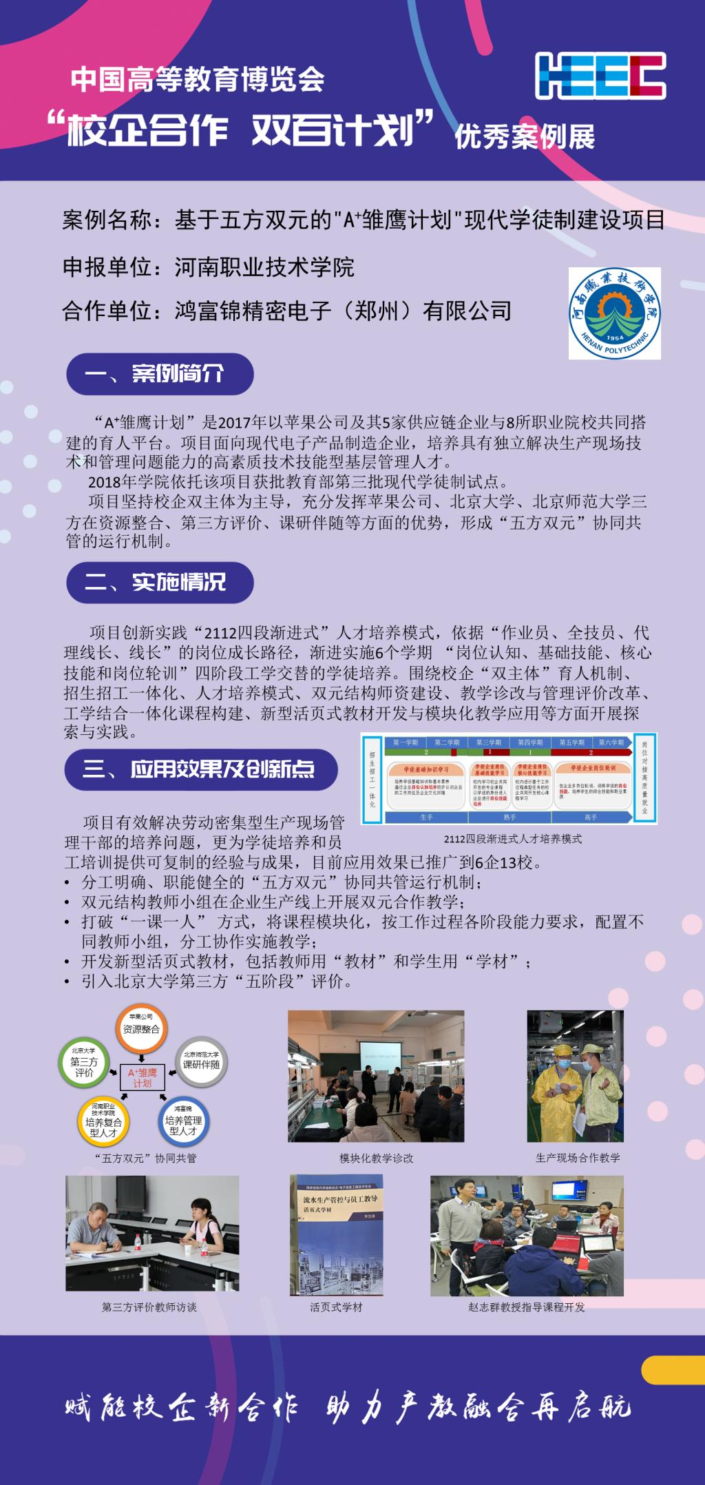 10月21日,2020年度中国高等教育博览会“校企合作 双百计划”路演展示案例名单公布,学校申报的专业建设类案例《基于五方双元的“A+雏鹰计划”现代学徒制建设项目》脱颖而出,成功入围现场路演与展示环节,并将于11月8-10日在长沙举办的第55届中国高等教育博览会(2020)现场进行路演、展示。