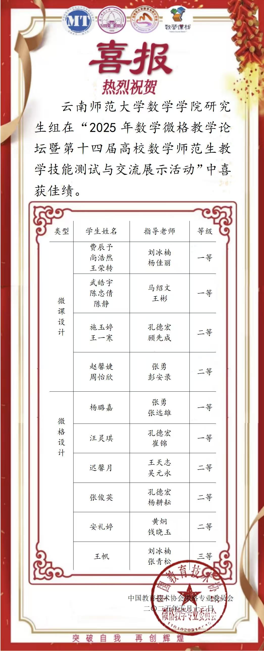 2025年5月9日至12日,由中国教育技术协会微格教学专业委员会主办、广西师范大学承办的2025年数学微格教学论坛暨第十四届高校数学师范生教学技能测试与交流展示活动在广西桂林顺利举行。我院学科教学(数学)专业的16名研究生在比赛中脱颖而出,取得了优异成绩,其中,微课设计一等奖6人,二等奖4人,微格设计一等奖2人,二等奖3人,三等奖1人。此外,我院被评为“优秀组织单位”。