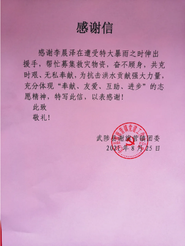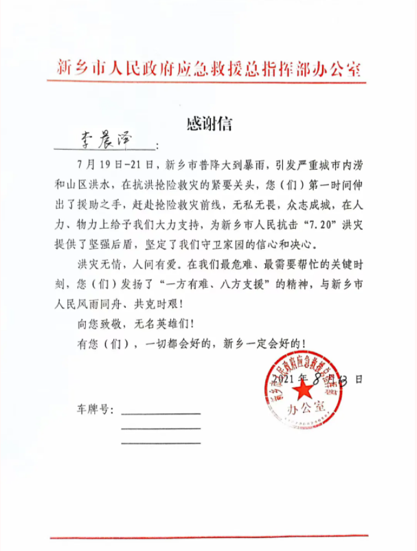 今年7月,河南发生区域性严重洪涝灾害,李晨泽化身志愿者,在为期半月的行动中,先后联络提供1000余次帮扶,为8万余受灾群众带来温暖和希望。时至8月,在疫情防控工作中,他再一次逆行而上,奔跑在社区中,护航全员核酸检测顺利进行。