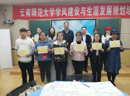 第二阶段培训于11月14日下午开展,夏磊老师进行了职业决策与行动计划等方面的课程培训。他阐述了职业生涯决策中的重要选择、大学生常见的职业决策问题、决策过程中的阻碍等内容,并对学生进行个别辅导、指导学生撰写生涯规划书。随后活动负责人夏慧组织全体学员分为10个小组团结协作绘制一位成员的职业规划海报,让学员更加直观地感受职业生涯规划的步骤和方法,随后小组成员上台展示,并投票选出优秀作品结业典礼于11月14日在数学学院216室举行。数学学院王源昌院长、刘冰楠老师、武海栋老师、夏磊老师为学员颁发培训证书及奖状。王院长勉励同学们进一步明确学习目标,端正学习态度,增强学习动力。。