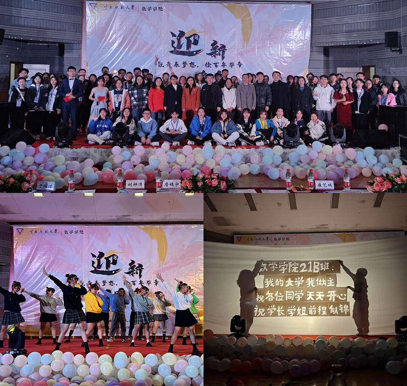 流光溢彩迎新夜,心心连心齐飞扬。为丰富校园文化,活跃学习气氛,给同学们提供一个真正展示自我风采和勇气的舞台,由数学学院主办的“数青春梦想,续百年华章”——2021年迎新晚会于2021年11月28日晚7点在云南师范大学汇文三区105报告厅成功举办。数学学院院长刘祥清老师、党委书记王源昌老师、党委副书记詹镇宇老师以及新生班主任、辅导员受邀出席晚会,同时参加此次活动的还有600余名本院学生及各学院学生代表。