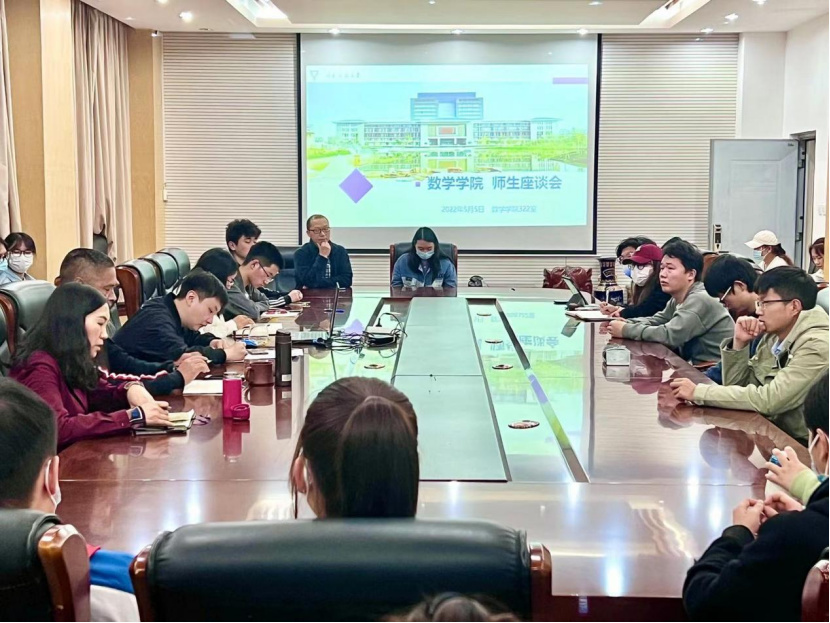 为了解学生近期学习、生活、就业动态,鼓励同学建言献策加强师生交流,2022年5月5日晚19:30云南师范大学数学学院师生座谈会在同析4-322会议室召开,学院党委书记王源昌院长刘祥清、副书记詹镇宇、陈绍雄副院长辅导员及全院各班级学生代表44人参加会议,会议由詹镇宇主持。