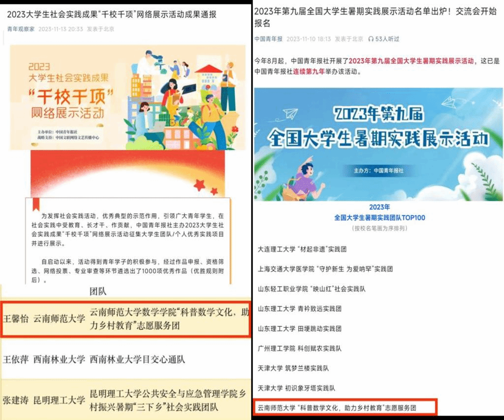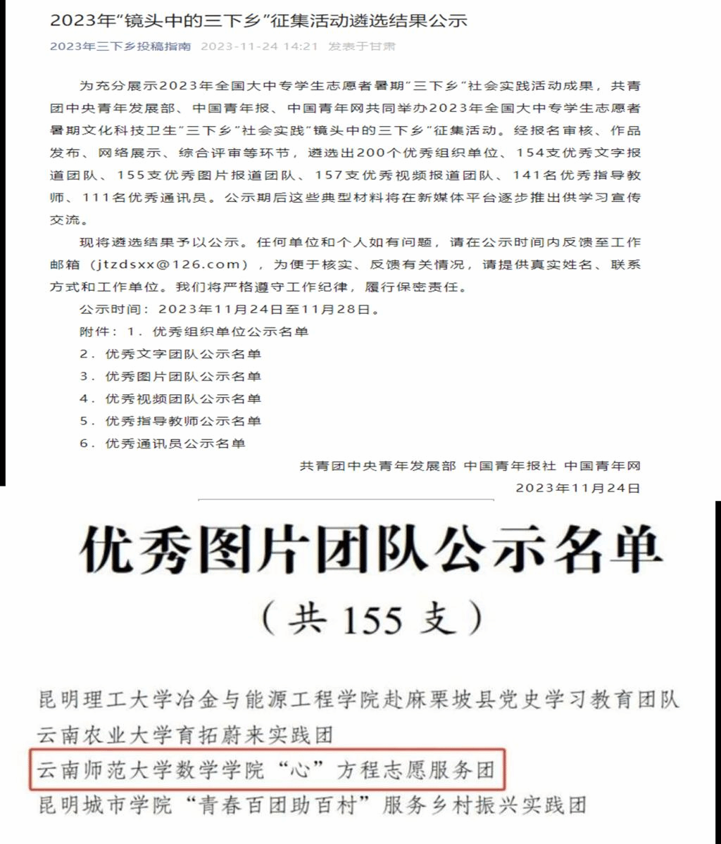 近日,2023年第九届全国大学生暑期实践展示活动、2023大学生社会实践成果“千校千项”网络展示活动、2023年“镜头中的三下乡”征集活动名单公布,我院“科普数学文化,助力乡村教育”志愿服务团入选2023年全国大学生暑期实践团队TOP100、荣获2023大学生社会实践成果“千校千项”网络展示活动优秀项目奖;“心”方程志愿服务团入选2023年全国大中专学生志愿者暑期文化科技卫生“三下乡”社会实践“镜头中的三下乡”优秀图片团队。