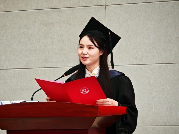师生代表发言,郝五零老师回顾了学生们从入校到毕业的成长历程,寄语毕业生永远保持“数学人”的严谨与求真、怀揣“师范生”的初心与热爱;毕业生代表罗倩分享了她大学四年的心路历程与收获感悟,诉说了在课堂、实验室和运动场的成长故事,表达了对母校的感恩和对未来的憧憬;在校生代表季乐鑫向毕业生致以崇高敬意和热烈祝贺并祝福他们在各自选择的星辰大海中乘风破浪,书写独一无二的人生篇章。
