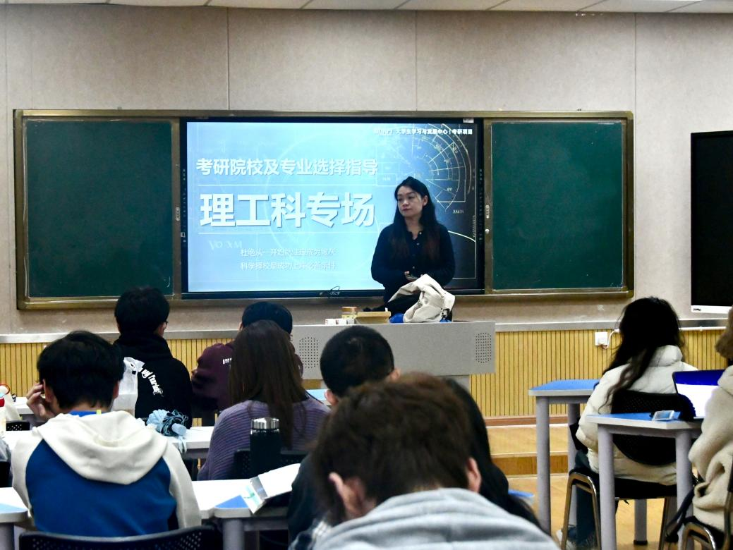 为切实解决数学学院学子考研备考中的困惑,助力大家明晰方向、高效备考,数学学院于2025年10月23日中午在同析4栋 308 教室成功举办考研培训专题讲座。本次活动特邀新东方全国硕士研究生考试研究中心研究员陆洁老师主讲,以 “考研院校及专业选择指导(理工科专场)” 为主题展开分享,吸引了众多有考研意向的数院学子到场学习。