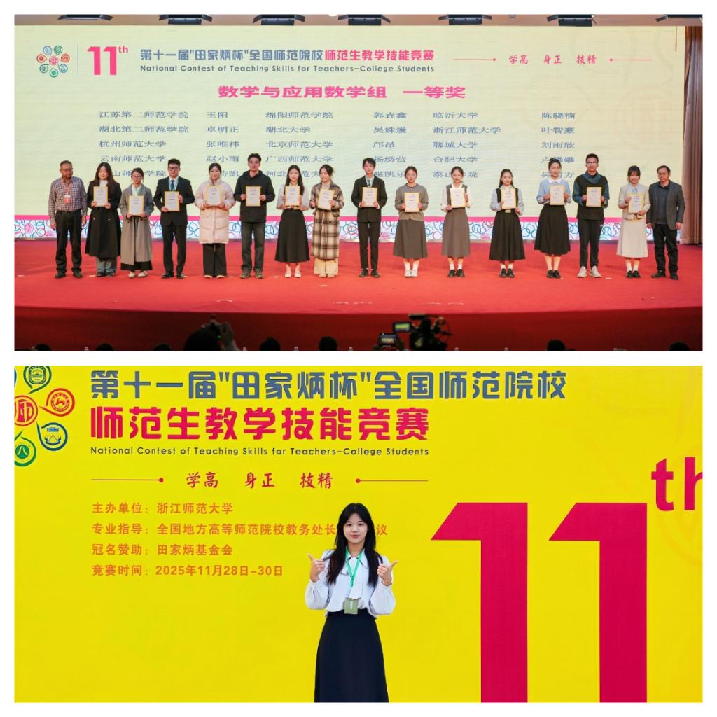2025年11月28-30日,第十一届“田家炳杯”全国师范院校师范生教学技能竞赛决赛在浙江师范大学举行。数学学院数学与应用数学专业2022级本科生赵小雨同学凭借过硬的专业素养和精湛的教学技能,在激烈竞争中脱颖而出,勇夺数学与应用数学组全国一等奖(全国仅15名)。