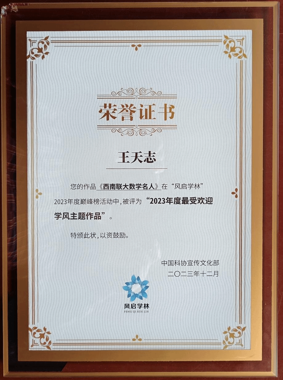 近日,我校数学学院全国科普教育基地“西南联大数学文化馆”负责人王天志老师的科普报告视频《西南联大数学名人》,在中国科学技术协会宣传文化部组织的“风启学林”2023年度巅峰榜活动中,被评为“2023年度最受欢迎学风主题作品”。(西南联大数学文化馆供稿)