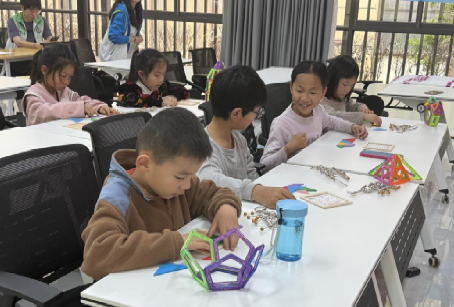 七块巧板拼万象,百般创意绘千图。活动伊始,志愿者们带领同学们走进七巧板的趣味世界。七巧板历史源远流长,最早可追溯至北宋时期。它由七块独特的板子构成,其中包含五块等腰直角三角形、一块正方形以及一块平行四边形。在志愿者的指导下,同学们亲手操作七巧板,通过不断尝试与组合,变幻出各式各样妙趣横生的图案。每一次成功的拼接,都让同学们感受到图形变换的魅力,加深了他们对几何图形的认识。