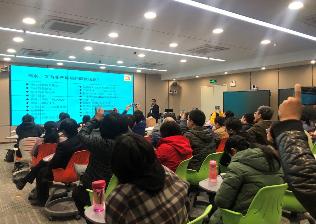 王寿斌教授从教师为什么要搞教科研、关于教科研的辩证法、教学研究与教育研究的基本特征及范畴、教师教科研潜质的内涵等方面入手分享了自己从事教科研多年以来的收获和感悟;介绍了如何紧扣主流媒体热点,发现问题、创新思考、引流潮流,提升自身的媒体素养和科研视野;归纳概括了当前和历年来职教热点与媒体呈现等方面内容,并从其近几年所关注的职教热门话题及对应发表的文章举例说明了如何选题和撰写;最后介绍了如何从日常活动、文献综述、甄别比较、热门话题、条件与困难排查、对创新的追问、热点追踪、企业与社会需求、校企合作与校校合作、前沿政策宣讲、“反弹琵琶”的冷思考等十几方面进行教科研课题的选题,并对课题拟题的要求及框架结构、教科研论文选题及写作进行了详细的分析并提出了针对性的意见和建议。