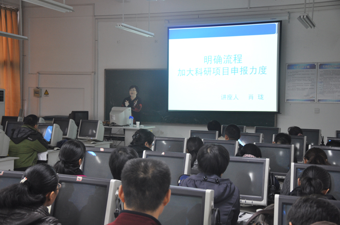 会上,肖珑副院长回顾了学院往年的科技项目申报情况,具体分析了该系的师资结构和在科研项目申报方面的优劣势,并分别从国家级项目、省级项目、地厅级项目的申报手续及注意事项等方面进行了科学、翔实地剖析和说明。她希望各位教职工加大科研工作投入的热情,提升自己的专业内涵与科研素养。