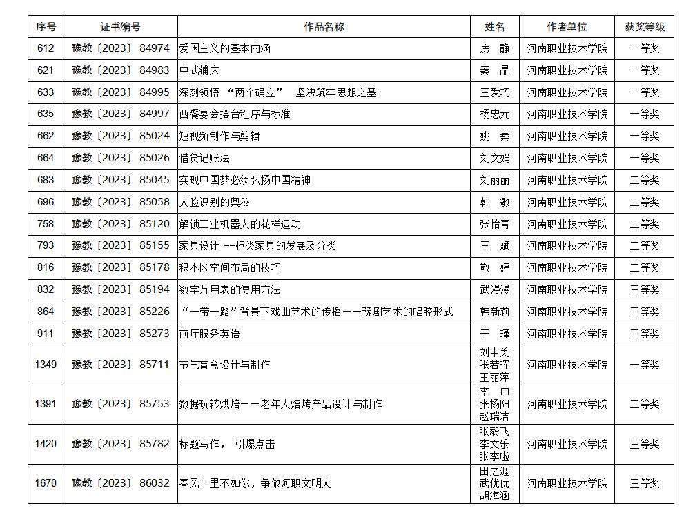 近日,河南省教育厅下发了《关于公布河南省第二十七届教育教学信息化交流活动评选结果的通知》。学校共有18件作品脱颖而出,获职业教育组微课一等奖6项、二等奖5项、三等奖3项,获职业教育组信息化教学课程案例一等奖1项、二等奖1项、三等奖1项,获优秀教育电视节目三等奖1项。