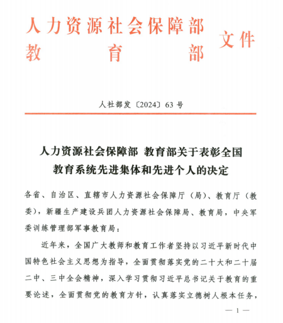 我校智能制造学院于2024年9月被评为“全国教育系统先进集体”。