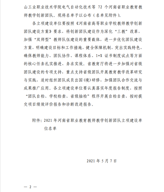 2021年5月,学校物联网应用技术专业获批“河南省职业教育教师教学创新团队”立项建设单位。